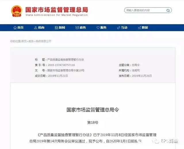 ????????11月26日,國(guó)家市場(chǎng)監(jiān)督管理總局發(fā)布《產(chǎn)品質(zhì)量監(jiān)督抽查管理暫行辦法》,將自2020年1月1日起施行。《辦法》共56條,明確了監(jiān)督抽查的組織、抽樣、檢驗(yàn)、異議處理、結(jié)果處理及相關(guān)人員應(yīng)承擔(dān)的法律責(zé)任,對(duì)于加強(qiáng)產(chǎn)品質(zhì)量監(jiān)督管理、規(guī)范產(chǎn)品質(zhì)量監(jiān)督抽查工作、保護(hù)消費(fèi)者的合法權(quán)益有重要意義。