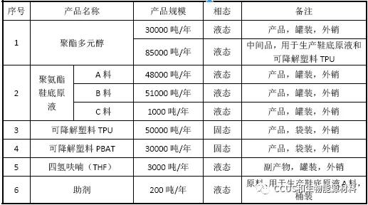 ????????建設規模:年產10 萬噸鞋底原液、3 萬噸聚酯多元醇、8 萬噸可降解塑料(5萬噸/年TPU、3萬噸/年PBAT)