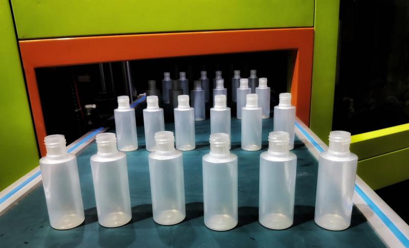 ????????本屆展會,精業(yè)機器展出了全自動一步法“注-拉-吹”機WISB-88AS,配合一出六腔的PET模具,在現(xiàn)場生產(chǎn)化妝品包裝中最常見的100ml精華液瓶,吸引了諸多目光。