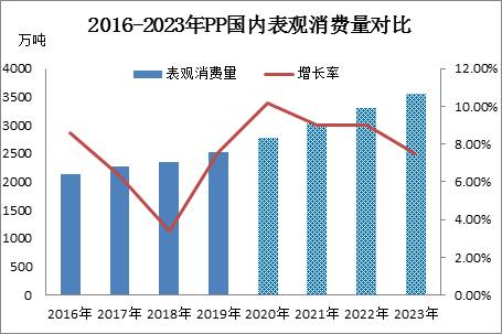 ????????2016-2020年PP表觀消費量呈現不規則“V”字型走勢,2020年之后受國內產能急劇上升之后有進入逐步放緩期,表觀消費在2020年之后將呈現震蕩小幅下挫趨勢。由上圖可發現,2016-2017年國內表觀消費量處于高位,在2018年急劇出現低位后快速攀升,主因2016-2017年正是國內經歷西北地區煤化工產能釋放后,集中供應期,市場需求也在穩步攀升,助推國內表觀消費量處于高位,但進入2018年后受環保及資金收緊等各方面因素制約,前期預計投產裝置多數推遲,導致2018年擴能總量繼續減少,同時進口量同比增幅逐步下降,導致2018年表觀消費量呈現下降趨勢。2019年-2020年擴能再次進入高峰期,助推國內表觀消費量再次攀升至高位。2020-2023年,表觀消費量繼續增長,但因基數偏大,增速或將放緩。
