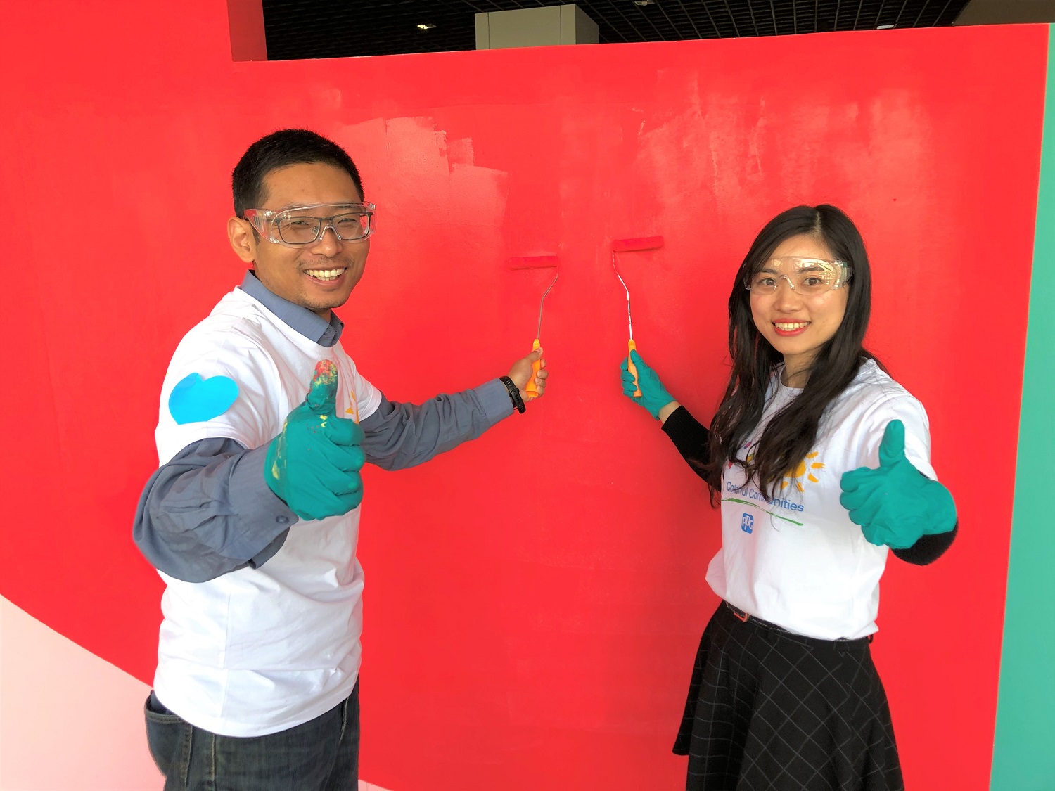 ????????受到文體活動中心建筑外立面為多種形狀的啟發(fā),此次粉刷活動以“七巧板”為主題,運用了七種不同顏色來營造出了一個明亮歡快、充滿運動活力的活動空間。PPG志愿者和社區(qū)代表志愿者不僅對文體活動中心的活動室內(nèi)墻與走廊進行了美化,還和他們的孩子一起繪制了有關航空和社區(qū)文化主題的長卷畫。