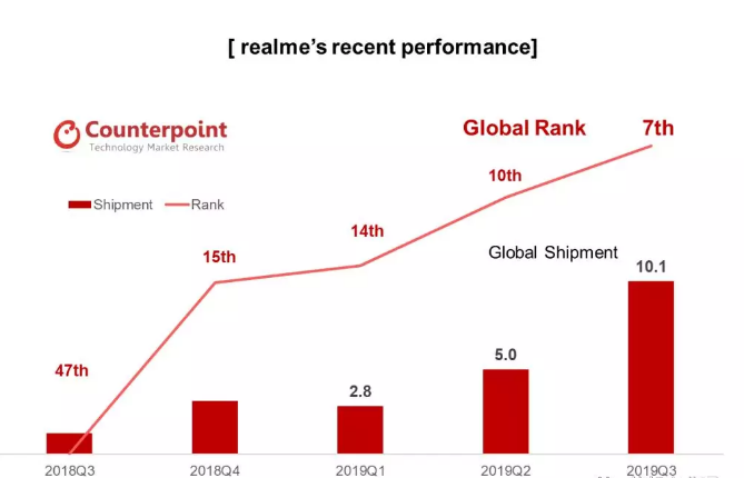 ????????據Counterpoint最新調研報告:realme手機第三季度出貨量超1000萬臺,同比增長808%,位列全球前7,成為全球成長最快的智能手機品牌。