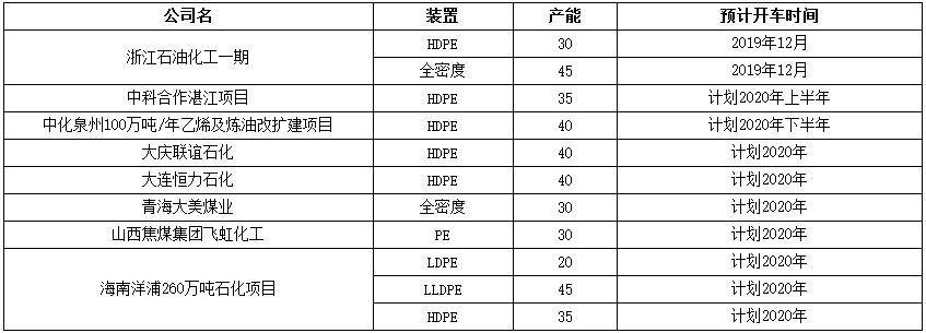 ????????2019年年內中安聯合35萬噸LLDPE裝置已經于7月30日開車生產,寧夏寶豐二期30萬噸HDPE裝置已經于9月27日投料生產,算上初步計劃四季度投產的浙江石化來說,截止2020那邊預期投產裝置初步預計為390萬噸。
