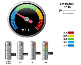 分項景氣指數(shù)中,利潤景氣指數(shù)環(huán)比回升,營收、出口、資產(chǎn)景氣指數(shù)環(huán)比下降,其中:營業(yè)收入景氣指數(shù)85.54,位于“漸冷”區(qū)間,較9月下降0.01點;出口景氣指數(shù)為86.66,位于“漸冷”區(qū)間,較9月下降3.59點;資產(chǎn)景氣指數(shù)為90.19,位于“穩(wěn)定”區(qū)間,較9月下降0.97點;利潤景氣指數(shù)89.91,位于“漸冷”區(qū)間,較9月回升0.82點。
