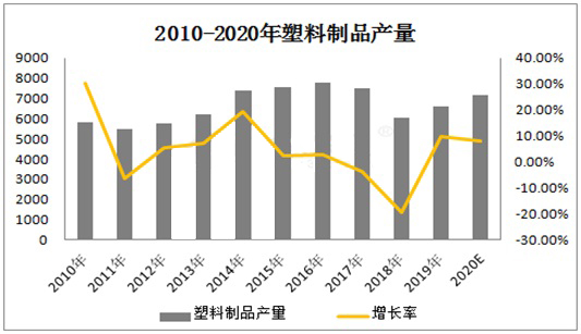 由2010-2020年塑料制品產量數據分析發現,國內塑料制品增速呈現逐步放緩趨勢,尤其在經歷了2014年高位之后,塑料制品整體增速呈現震蕩下滑趨勢。分析塑料制品快速下滑主要原因是國內環保嚴查,同時在中美貿易戰影響下,代加工企業減少所致。2019年后塑料制品增速再度放緩,主因全球經濟增長乏力,國內經濟環境影響下游制品企業訂單跟進不足,導致塑料產品整體產量相對減少。