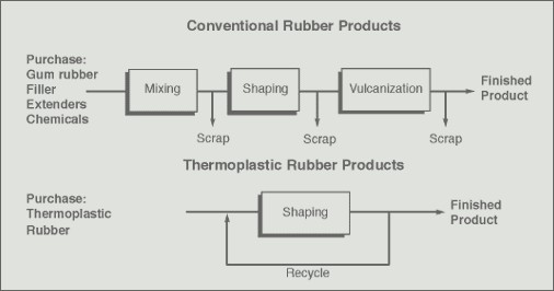 熱塑性彈性體可以反復加工的特點,決定了它優于熱固性橡膠的主要優越性。兩者在加工方面的其它關鍵性區別如下表所示。