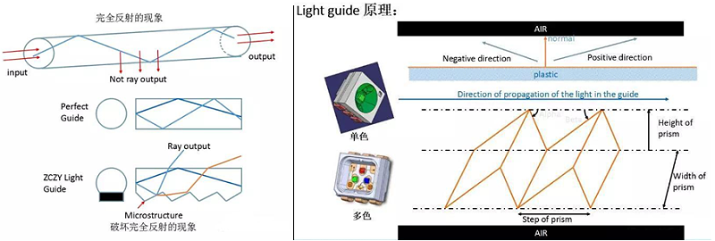 光通過圓形或其它特定形狀透明材質時,會發生全反射現象。如果我們破壞完全反射條件,使光從透明材質表面流出,在汽車領域稱為光導(Light Guide)。