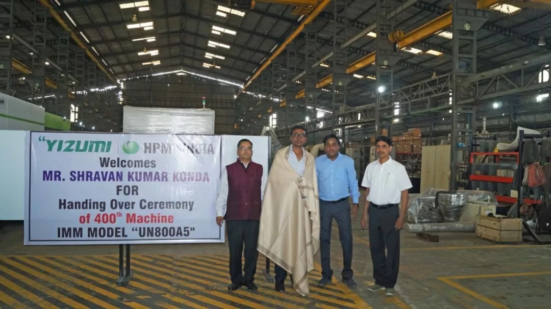 ????????2019年12月25日,伊之密印度工廠生產(chǎn)的 UN800A5 注塑機成功交付給當(dāng)?shù)乜蛻鬝hriyan Polymers公司。這是印度子公司銷售的第400臺注塑機。伊之密在工廠內(nèi)舉行了一個簡單而隆重的儀式,紀(jì)念這一里程碑。