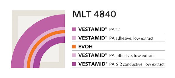 ????????MLT 4840的特殊之處在于,它的內層不是由含氟聚合物制成,而是由導電、低淬取性的VESTAMID聚酰胺612制成。因此,該系統非常適合使用擠出工藝加工,即使在與酒精長期接觸后也有優異的抗靜電性能。