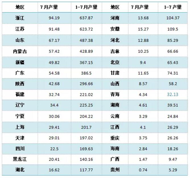 ????????1-7月初級形態塑料產量排名前五位(浙江、江蘇、山東、內蒙古和廣東)的總產量達到2564.36萬噸,占到全國總產量47%。(按7月規模企業統計)