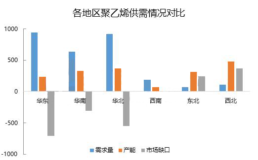 ????????近年國(guó)內(nèi)產(chǎn)能的不斷增加,各地區(qū)供需情況也有所改變。東北地區(qū)是我國(guó)老工業(yè)基地,是中油系統(tǒng)裝置集中地區(qū),東北地區(qū)下游需求占國(guó)內(nèi)需求占比較小,是國(guó)內(nèi)PE產(chǎn)品輸出型地區(qū)。另外,西北地區(qū)依托豐富的煤炭資源,近年煤制裝置搞通文化路,西北地區(qū)產(chǎn)能快速增長(zhǎng)。西北地區(qū)同東北地區(qū)一樣,產(chǎn)能分布集中,但下游需求較少,也是我國(guó)主要的PE產(chǎn)品輸出地。國(guó)內(nèi)主要的下游需求地區(qū)為華東地區(qū)、華南地區(qū)和華北地區(qū)。其中,最大的消費(fèi)地區(qū)為華東地區(qū),華東地區(qū)聚乙烯消費(fèi)點(diǎn)全國(guó)總消費(fèi)量的三分之一左右,但華東地區(qū)當(dāng)?shù)負(fù)碛械漠a(chǎn)能有限,占全國(guó)總產(chǎn)能的13%。華東地區(qū)年P(guān)E消費(fèi)量在900萬(wàn)噸以上,進(jìn)口產(chǎn)品充斥華東市場(chǎng)。華東區(qū)域是PE產(chǎn)品最大的凈流入地區(qū),隨著國(guó)際與國(guó)內(nèi)的快速擴(kuò)能,華東地區(qū)是進(jìn)口產(chǎn)品與國(guó)產(chǎn)產(chǎn)品必爭(zhēng)之地,價(jià)格競(jìng)爭(zhēng)也將進(jìn)入白熱化狀態(tài),未來(lái)華東地區(qū)很可能成為國(guó)內(nèi)價(jià)格洼地,進(jìn)口低價(jià)產(chǎn)品對(duì)市場(chǎng)價(jià)格沖擊明顯。華北地區(qū)與華南地區(qū)作為主要的消費(fèi)地區(qū),情況與華東地區(qū)相類似,是國(guó)內(nèi)外PE產(chǎn)品的主要消費(fèi)目的地,來(lái)自供應(yīng)端的壓力不斷增加,市場(chǎng)競(jìng)爭(zhēng)日益加劇。