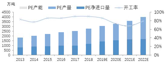 ????????PE國(guó)內(nèi)產(chǎn)能不斷擴(kuò)增的同時(shí),國(guó)際PE產(chǎn)能同樣快速增長(zhǎng),尤其近年來(lái)北美及中東地區(qū)以輕烴為原料的PE裝置快速投產(chǎn),我國(guó)是國(guó)際PE產(chǎn)品主要消費(fèi)國(guó),國(guó)際PE產(chǎn)品的主要消費(fèi)目的地,導(dǎo)致我國(guó)PE進(jìn)口量仍保持快速增長(zhǎng)。近年P(guān)E進(jìn)口依存度仍保持在50%左右。進(jìn)口PE產(chǎn)品依托其成本價(jià)格優(yōu)勢(shì),在國(guó)內(nèi)仍占有一席之地,預(yù)計(jì)PE進(jìn)口依存度下降緩慢。2019年國(guó)內(nèi)PE表觀需求量預(yù)計(jì)在3270萬(wàn)噸左右,產(chǎn)量將達(dá)到1745萬(wàn)噸,進(jìn)口量在1550萬(wàn)噸左右,國(guó)內(nèi)PE進(jìn)口依存度約在49%左右。隨著國(guó)內(nèi)PE新增產(chǎn)能陸續(xù)釋放,預(yù)計(jì)2020-2022年國(guó)內(nèi)PE裝置開工率或有所下降。