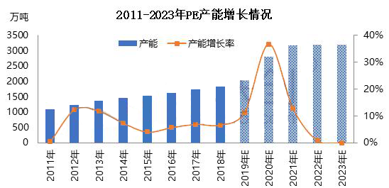 ????????2019年國(guó)內(nèi)聚烯烴市場(chǎng)壓力主要來(lái)自于供應(yīng)端的增加,裝置擴(kuò)能供應(yīng)增加的聲音始終貫穿全年,市場(chǎng)銷售壓力加劇,價(jià)格承壓下跌。從國(guó)內(nèi)PE產(chǎn)能增長(zhǎng)來(lái)看,2012年國(guó)內(nèi)PE產(chǎn)能增速在12.4%。2019-2020年將迎來(lái)國(guó)內(nèi)PE產(chǎn)能的另一輪增長(zhǎng)高峰。盡管2019年多套計(jì)劃投產(chǎn)裝置投產(chǎn)計(jì)劃延期,但行業(yè)擴(kuò)能增速仍將在2020年超過(guò)35%創(chuàng)歷史新高。