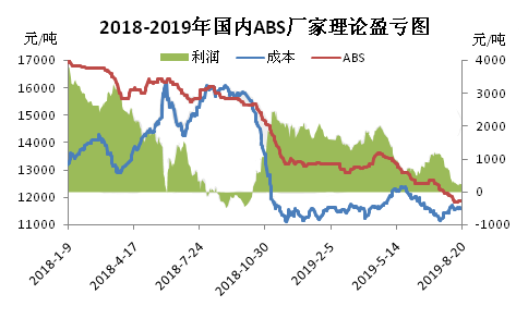 ????????自2019年4月中旬起,國內ABS市場開啟持續下滑走勢。截至8月20日,華東ABS市場國產料主流報盤在11450-12300元/噸,而國產ABS企業理論生產成本至11571元/噸。部分低端ABS已跌破理論生產成本線,高端料理論上盈利水平亦縮至低位。成本面支撐下,ABS市場表現出一定的抗跌性。