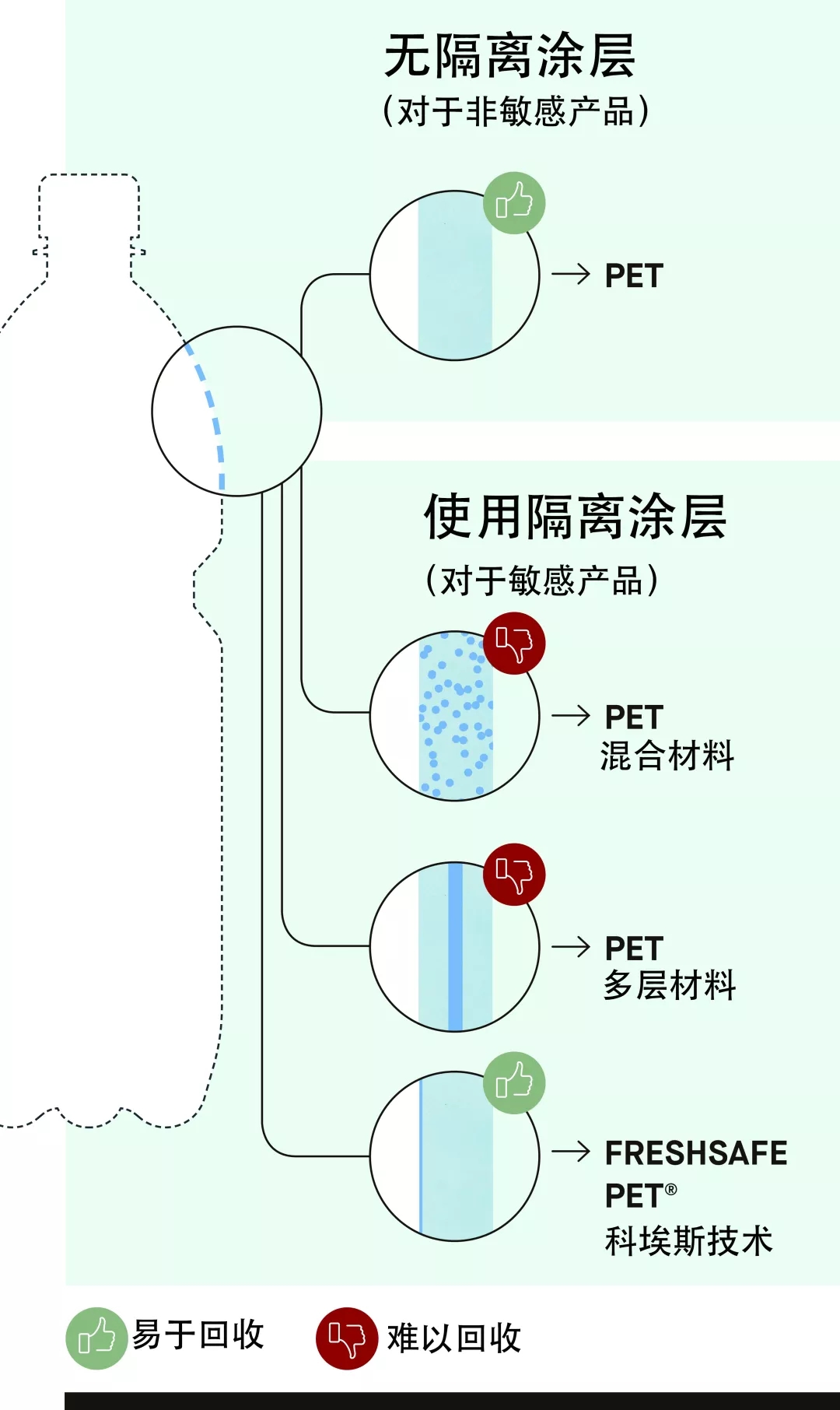 ????????在這種系統中,PET瓶經過吹瓶, 其 瓶的內壁會立即涂覆一層輕薄的玻璃涂層。這個玻璃層能形成一層屏障,阻止飲料風味和二氧化碳逃逸,同時保證氧氣不會滲入瓶內,從而防止維生素流失。對使用FreshSafe PET? 涂層技術的PET瓶,飲料的味道和新鮮度能維持更長時間。在回收過程中,玻璃涂層會被標準過程中的苛性堿沖洗掉。