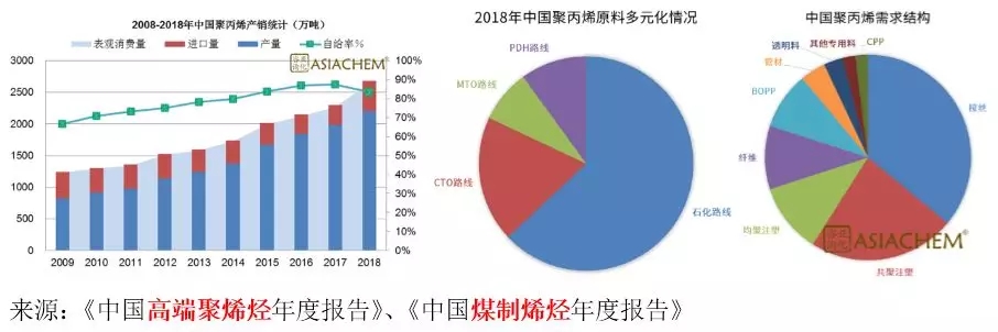 ????????聚丙烯(PP)是需求量最大的通用聚烯烴(PO)產品之一,在全球的消費量僅次于聚乙烯(PE)。中國是PP生產和消費大國。亞化咨詢數據顯示,截至2018年底中國已建成投產PP產能約2400萬噸/年,并且形成了石化、煤化工(CTO/MTO/MTP)、丙烷脫氫(PDH)等原料路線多元化發展的趨勢。中國PP需求量呈現穩定增長,2018年表觀消費量約2600萬噸,供需缺口近400萬噸。中國PP主要消費領域是拉絲、注塑和纖維等,應用于包裝、電子、與家電、汽車、纖維、建筑管材等領域。