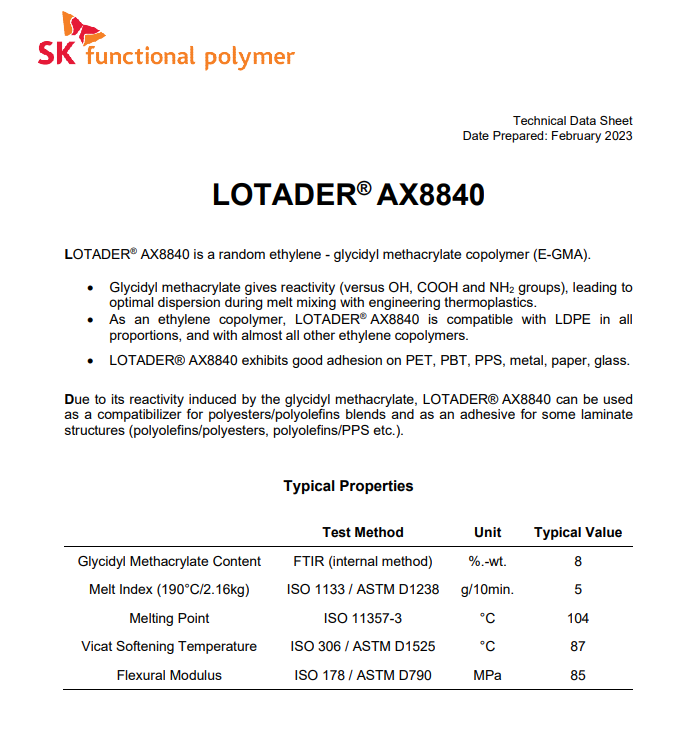 - EMA 法國阿科瑪Lotader AX 8840 粘接性好 無規共聚物 可分散 塑料改性 粘合劑 物性表, EMA 法國阿科瑪Lotader AX 8840 粘接性好 無規共聚物 可分散 塑料改性 粘合劑 產品參數,EMA 法國阿科瑪Lotader AX 8840 粘接性好 無規共聚物 可分散 塑料改性 粘合劑 性能表,EMA 法國阿科瑪Lotader AX 8840 粘接性好 無規共聚物 可分散 塑料改性 粘合劑 出廠報告, MSDS,, 物質安全資料表, UL黃卡,{ SGS報告, RoHS, 食品級認證, NSF飲用水標準, 產品資料, 產品性能, 出廠報告, 原廠原包, 代理商, 熱變形溫度, 熔指數, 流動系數, 抗沖擊性能、沖擊強度, 低溫韌性、低溫抗沖擊性能, 熔體流動系數、熔體流動速率, 加工工藝、加工參數、加工溫度, 歐盟RoHS 德國FDA 美國FDA 日本FDA