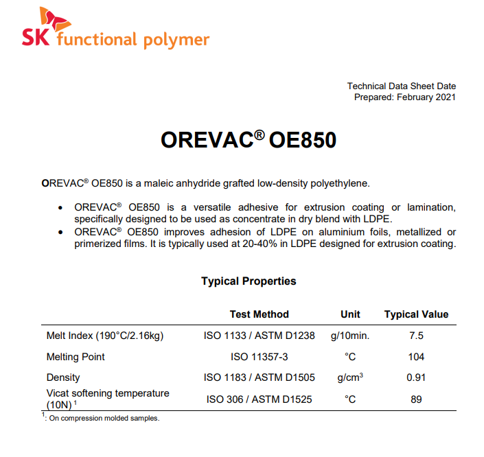 - 阿科瑪Orevac® OE850粘結樹脂粘結樹脂 物性表, 阿科瑪Orevac® OE850粘結樹脂粘結樹脂 產品參數,阿科瑪Orevac® OE850粘結樹脂粘結樹脂 性能表,阿科瑪Orevac® OE850粘結樹脂粘結樹脂 出廠報告, MSDS,, 物質安全資料表, UL黃卡,{ SGS報告, RoHS, 食品級認證, NSF飲用水標準, 產品資料, 產品性能, 出廠報告, 原廠原包, 代理商, 熱變形溫度, 熔指數, 流動系數, 抗沖擊性能、沖擊強度, 低溫韌性、低溫抗沖擊性能, 熔體流動系數、熔體流動速率, 加工工藝、加工參數、加工溫度, 歐盟RoHS 德國FDA 美國FDA 日本FDA