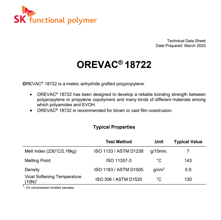 - PP馬來酸酐改性聚丙烯 法國阿科瑪 Orevac 18722 共擠薄膜粘接性 物性表, PP馬來酸酐改性聚丙烯 法國阿科瑪 Orevac 18722 共擠薄膜粘接性 產品參數,PP馬來酸酐改性聚丙烯 法國阿科瑪 Orevac 18722 共擠薄膜粘接性 性能表,PP馬來酸酐改性聚丙烯 法國阿科瑪 Orevac 18722 共擠薄膜粘接性 出廠報告, MSDS,, 物質安全資料表, UL黃卡,{ SGS報告, RoHS, 食品級認證, NSF飲用水標準, 產品資料, 產品性能, 出廠報告, 原廠原包, 代理商, 熱變形溫度, 熔指數, 流動系數, 抗沖擊性能、沖擊強度, 低溫韌性、低溫抗沖擊性能, 熔體流動系數、熔體流動速率, 加工工藝、加工參數、加工溫度, 歐盟RoHS 德國FDA 美國FDA 日本FDA