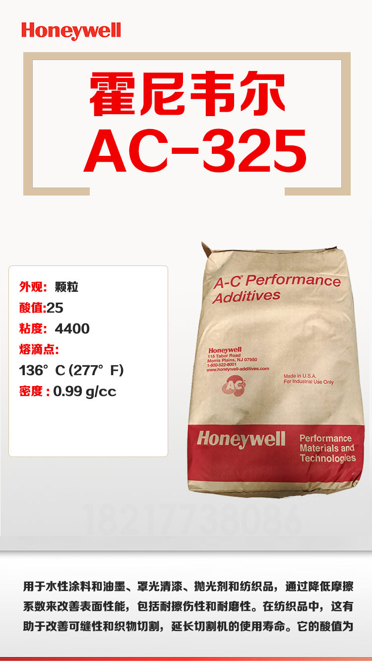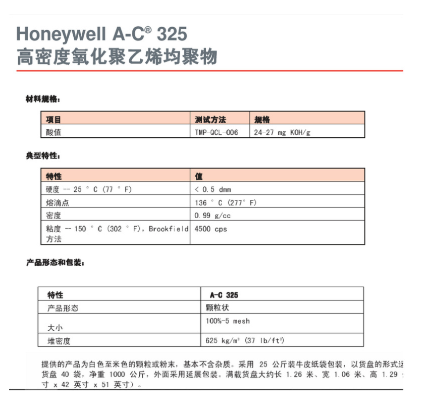 • Honeywell霍尼韋爾氧化聚乙烯蠟 A-C 325 蠟粉 酸值高易乳化 物性表, Honeywell霍尼韋爾氧化聚乙烯蠟 A-C 325 蠟粉 酸值高易乳化 產品參數,Honeywell霍尼韋爾氧化聚乙烯蠟 A-C 325 蠟粉 酸值高易乳化 性能表,Honeywell霍尼韋爾氧化聚乙烯蠟 A-C 325 蠟粉 酸值高易乳化 出廠報告, MSDS,, 物質安全資料表, UL黃卡,{ SGS報告, RoHS, 食品級認證, NSF飲用水標準, 產品資料, 產品性能, 出廠報告, 原廠原包, 代理商, 熱變形溫度, 熔指數, 流動系數, 抗沖擊性能、沖擊強度, 低溫韌性、低溫抗沖擊性能, 熔體流動系數、熔體流動速率, 加工工藝、加工參數、加工溫度, 歐盟RoHS 德國FDA 美國FDA 日本FDA