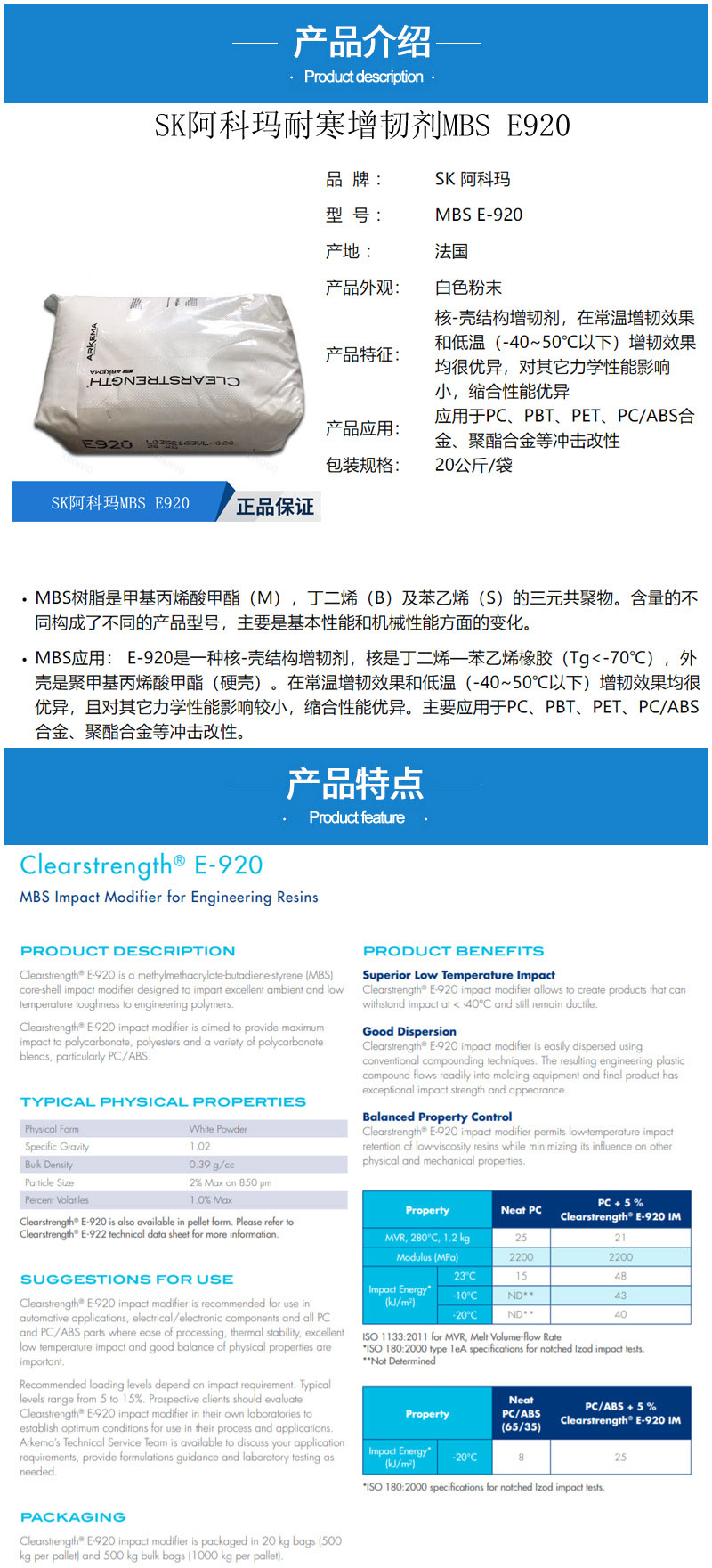 - 增韌劑MBS E920 抗沖擊改性劑 PC/ABS工程塑料增韌 SK阿科瑪E-920 物性表, 增韌劑MBS E920 抗沖擊改性劑 PC/ABS工程塑料增韌 SK阿科瑪E-920 產(chǎn)品參數(shù),增韌劑MBS E920 抗沖擊改性劑 PC/ABS工程塑料增韌 SK阿科瑪E-920 性能表,增韌劑MBS E920 抗沖擊改性劑 PC/ABS工程塑料增韌 SK阿科瑪E-920 出廠報(bào)告, MSDS,, 物質(zhì)安全資料表, UL黃卡,{ SGS報(bào)告, RoHS, 食品級認(rèn)證, NSF飲用水標(biāo)準(zhǔn), 產(chǎn)品資料, 產(chǎn)品性能, 出廠報(bào)告, 原廠原包, 代理商, 熱變形溫度, 熔指數(shù), 流動(dòng)系數(shù), 抗沖擊性能、沖擊強(qiáng)度, 低溫韌性、低溫抗沖擊性能, 熔體流動(dòng)系數(shù)、熔體流動(dòng)速率, 加工工藝、加工參數(shù)、加工溫度, 歐盟RoHS 德國FDA 美國FDA 日本FDA