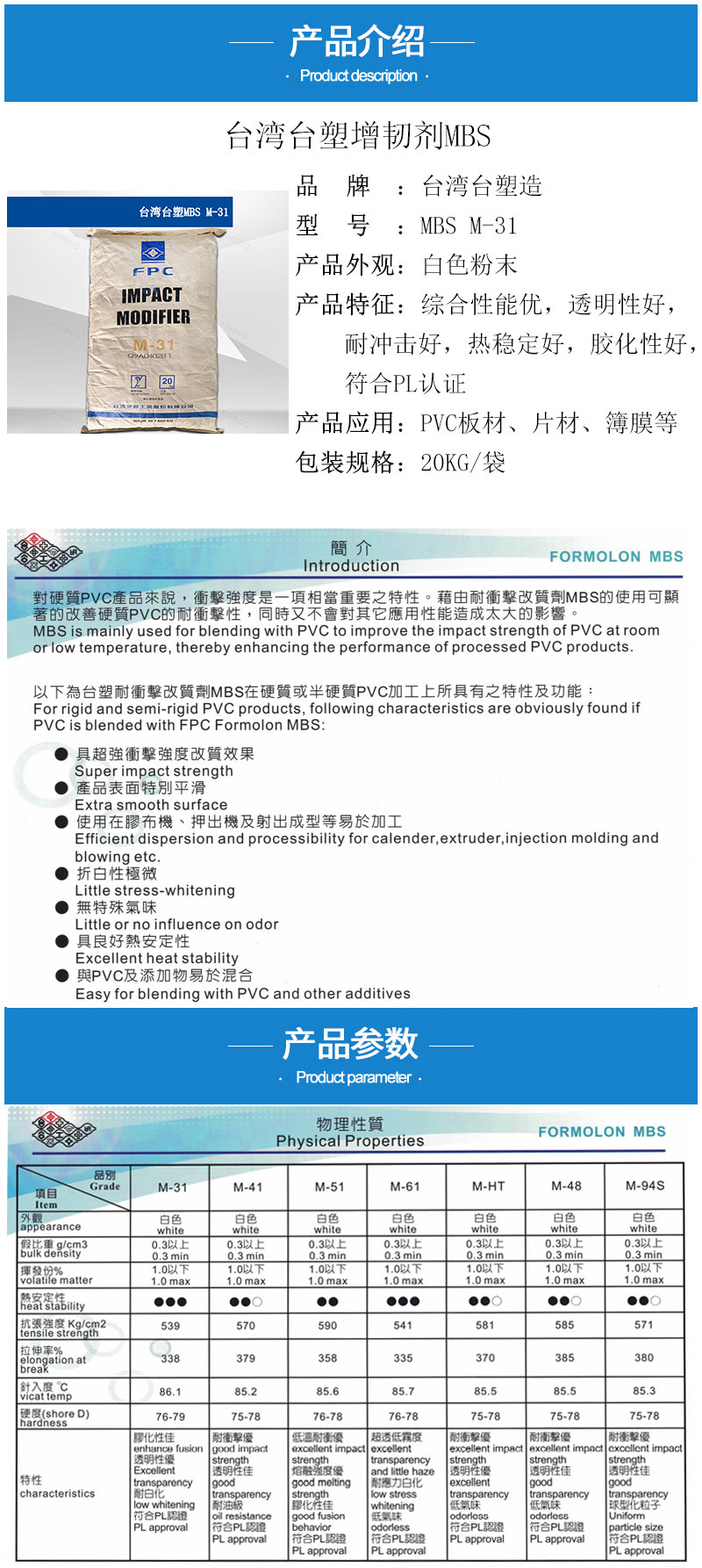 - 臺塑MBS M31綜合性能好 透明耐白化 PVC簿膜 板材片材 增韌劑M-31 物性表, 臺塑MBS M31綜合性能好 透明耐白化 PVC簿膜 板材片材 增韌劑M-31 產(chǎn)品參數(shù),臺塑MBS M31綜合性能好 透明耐白化 PVC簿膜 板材片材 增韌劑M-31 性能表,臺塑MBS M31綜合性能好 透明耐白化 PVC簿膜 板材片材 增韌劑M-31 出廠報告, MSDS,, 物質(zhì)安全資料表, UL黃卡,{ SGS報告, RoHS, 食品級認(rèn)證, NSF飲用水標(biāo)準(zhǔn), 產(chǎn)品資料, 產(chǎn)品性能, 出廠報告, 原廠原包, 代理商, 熱變形溫度, 熔指數(shù), 流動系數(shù), 抗沖擊性能、沖擊強(qiáng)度, 低溫韌性、低溫抗沖擊性能, 熔體流動系數(shù)、熔體流動速率, 加工工藝、加工參數(shù)、加工溫度, 歐盟RoHS 德國FDA 美國FDA 日本FDA
