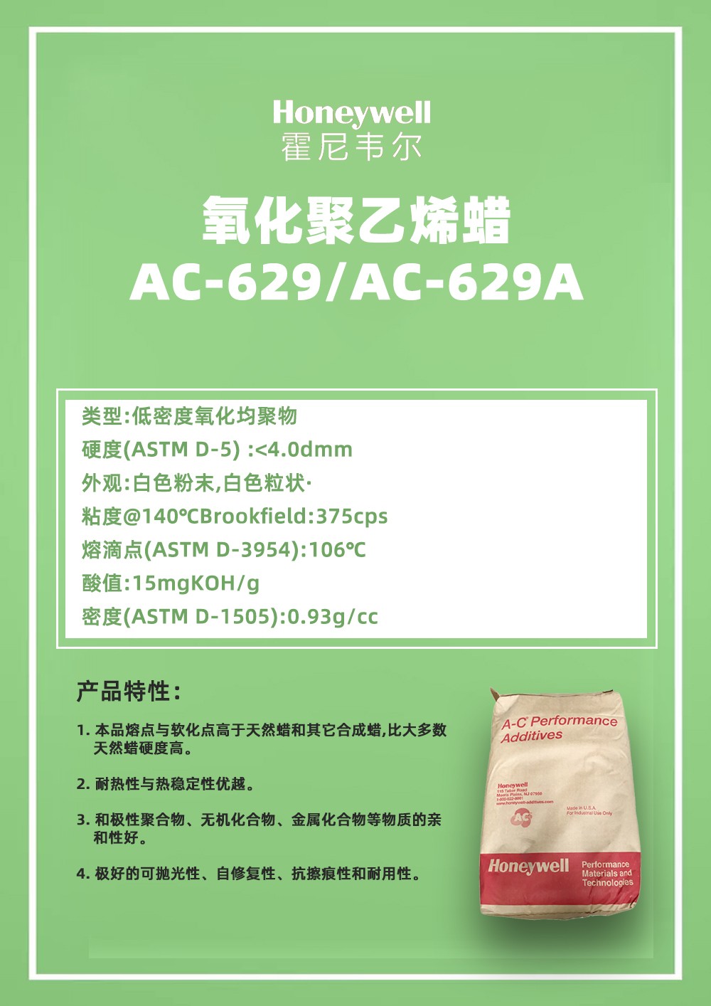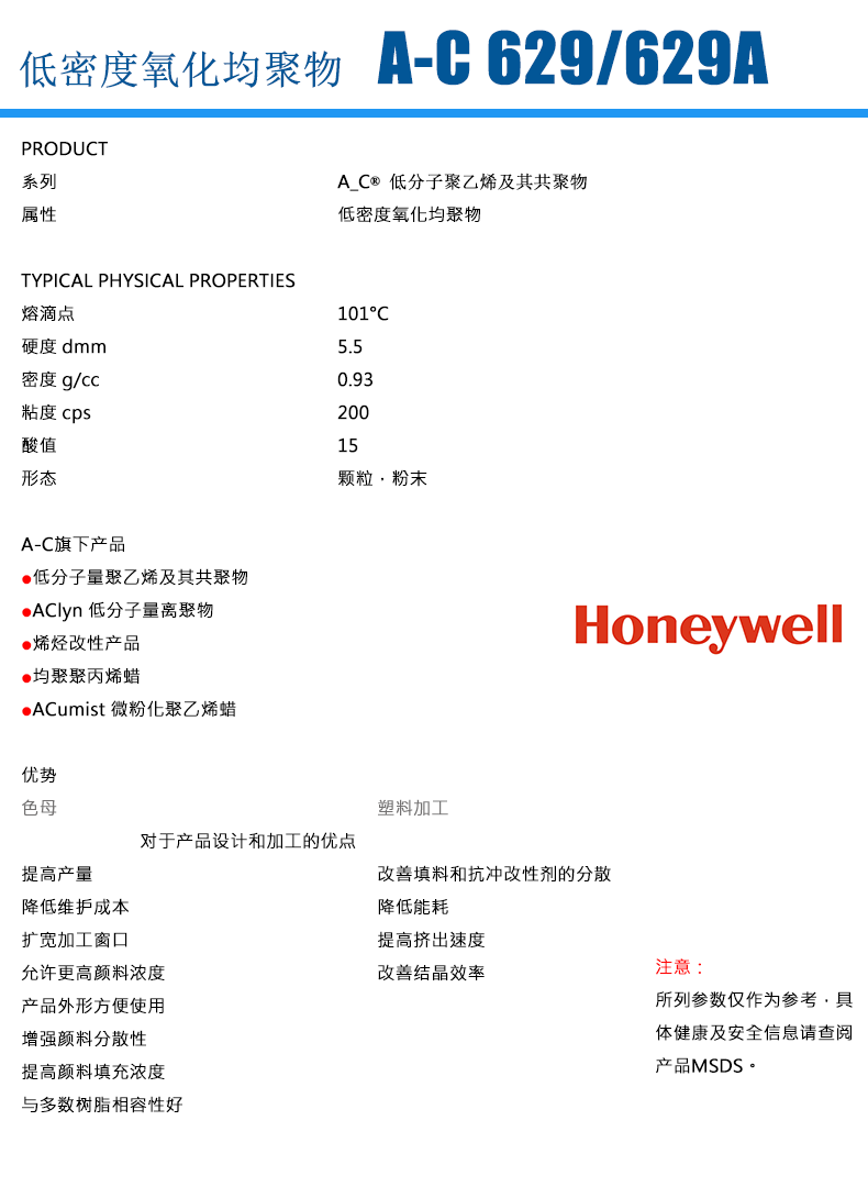 • Honeywell 霍尼韋爾氧化聚乙烯蠟A-C629A蠟粉 物性表, Honeywell 霍尼韋爾氧化聚乙烯蠟A-C629A蠟粉 產品參數,Honeywell 霍尼韋爾氧化聚乙烯蠟A-C629A蠟粉 性能表,Honeywell 霍尼韋爾氧化聚乙烯蠟A-C629A蠟粉 出廠報告, MSDS,, 物質安全資料表, UL黃卡,{ SGS報告, RoHS, 食品級認證, NSF飲用水標準, 產品資料, 產品性能, 出廠報告, 原廠原包, 代理商, 熱變形溫度, 熔指數, 流動系數, 抗沖擊性能、沖擊強度, 低溫韌性、低溫抗沖擊性能, 熔體流動系數、熔體流動速率, 加工工藝、加工參數、加工溫度, 歐盟RoHS 德國FDA 美國FDA 日本FDA