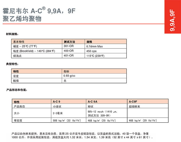 - 霍尼韋爾 A-C® 9A 低密度聚乙烯 (LDPE) 均聚物 物性表, 霍尼韋爾 A-C® 9A 低密度聚乙烯 (LDPE) 均聚物 產品參數,霍尼韋爾 A-C® 9A 低密度聚乙烯 (LDPE) 均聚物 性能表,霍尼韋爾 A-C® 9A 低密度聚乙烯 (LDPE) 均聚物 出廠報告, MSDS,, 物質安全資料表, UL黃卡,{ SGS報告, RoHS, 食品級認證, NSF飲用水標準, 產品資料, 產品性能, 出廠報告, 原廠原包, 代理商, 熱變形溫度, 熔指數, 流動系數, 抗沖擊性能、沖擊強度, 低溫韌性、低溫抗沖擊性能, 熔體流動系數、熔體流動速率, 加工工藝、加工參數、加工溫度, 歐盟RoHS 德國FDA 美國FDA 日本FDA