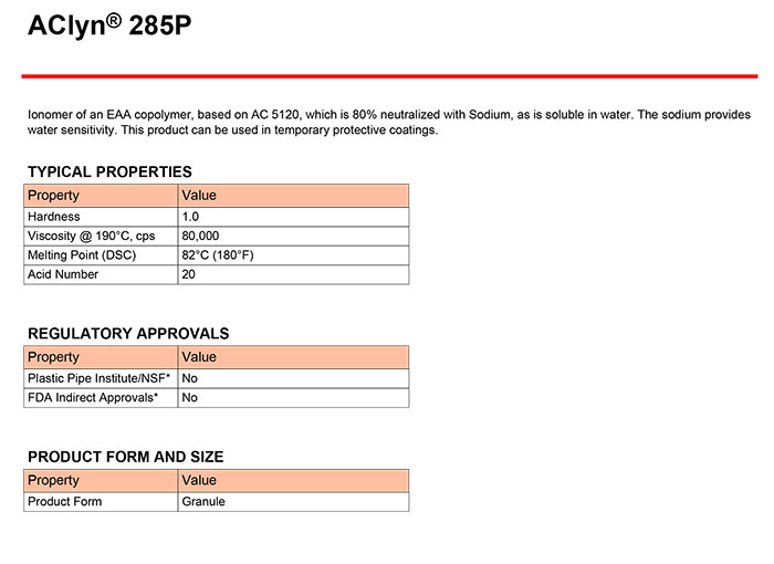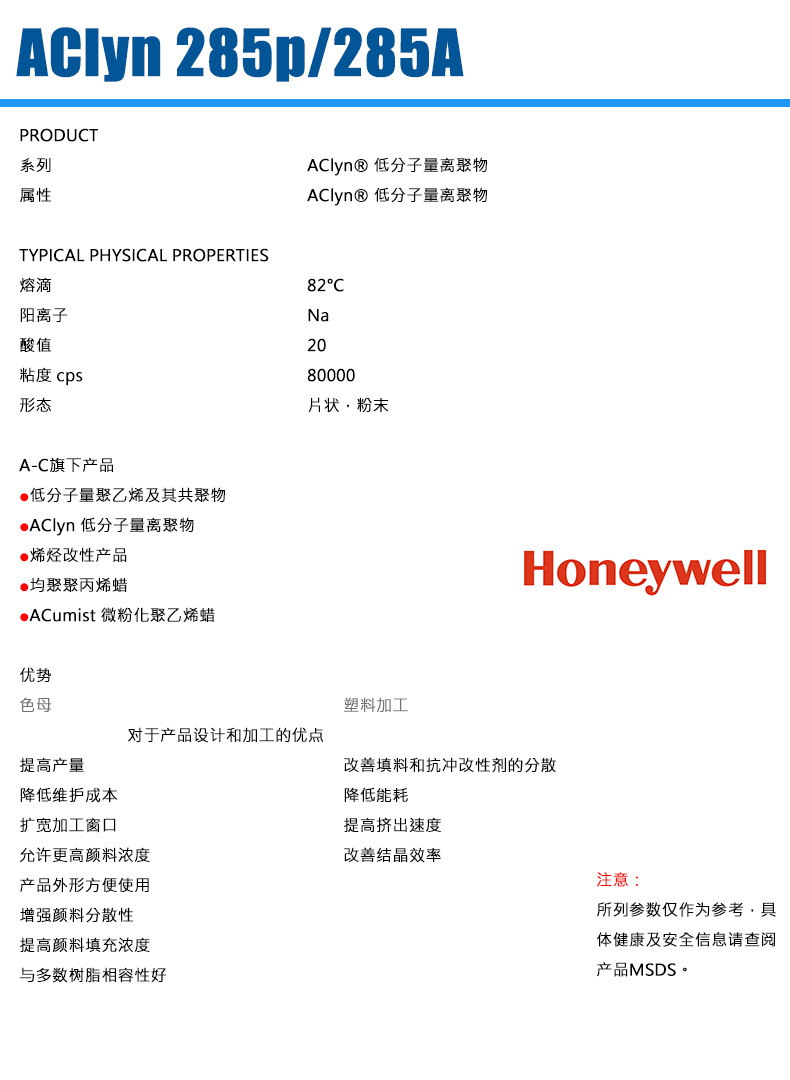 • 霍尼韋爾EAA離聚物蠟粉AClyn® 285P 結晶成核劑 物性表, 霍尼韋爾EAA離聚物蠟粉AClyn® 285P 結晶成核劑 產品參數,霍尼韋爾EAA離聚物蠟粉AClyn® 285P 結晶成核劑 性能表,霍尼韋爾EAA離聚物蠟粉AClyn® 285P 結晶成核劑 出廠報告, MSDS,, 物質安全資料表, UL黃卡,{ SGS報告, RoHS, 食品級認證, NSF飲用水標準, 產品資料, 產品性能, 出廠報告, 原廠原包, 代理商, 熱變形溫度, 熔指數, 流動系數, 抗沖擊性能、沖擊強度, 低溫韌性、低溫抗沖擊性能, 熔體流動系數、熔體流動速率, 加工工藝、加工參數、加工溫度, 歐盟RoHS 德國FDA 美國FDA 日本FDA