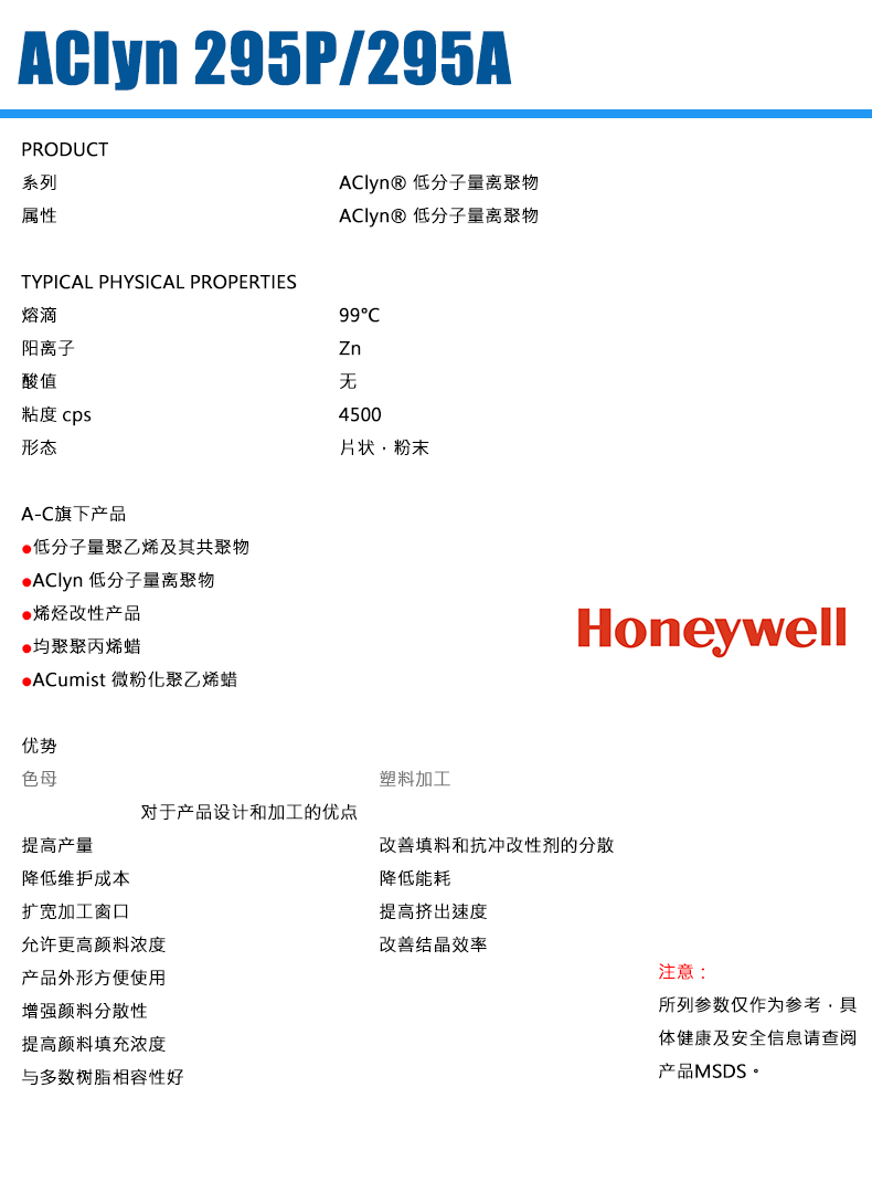 • Honeywell(霍尼韋爾) Acyln 295A低分子量離聚物 PBT尼龍成核劑 物性表, Honeywell(霍尼韋爾) Acyln 295A低分子量離聚物 PBT尼龍成核劑 產品參數,Honeywell(霍尼韋爾) Acyln 295A低分子量離聚物 PBT尼龍成核劑 性能表,Honeywell(霍尼韋爾) Acyln 295A低分子量離聚物 PBT尼龍成核劑 出廠報告, MSDS,, 物質安全資料表, UL黃卡,{ SGS報告, RoHS, 食品級認證, NSF飲用水標準, 產品資料, 產品性能, 出廠報告, 原廠原包, 代理商, 熱變形溫度, 熔指數, 流動系數, 抗沖擊性能、沖擊強度, 低溫韌性、低溫抗沖擊性能, 熔體流動系數、熔體流動速率, 加工工藝、加工參數、加工溫度, 歐盟RoHS 德國FDA 美國FDA 日本FDA