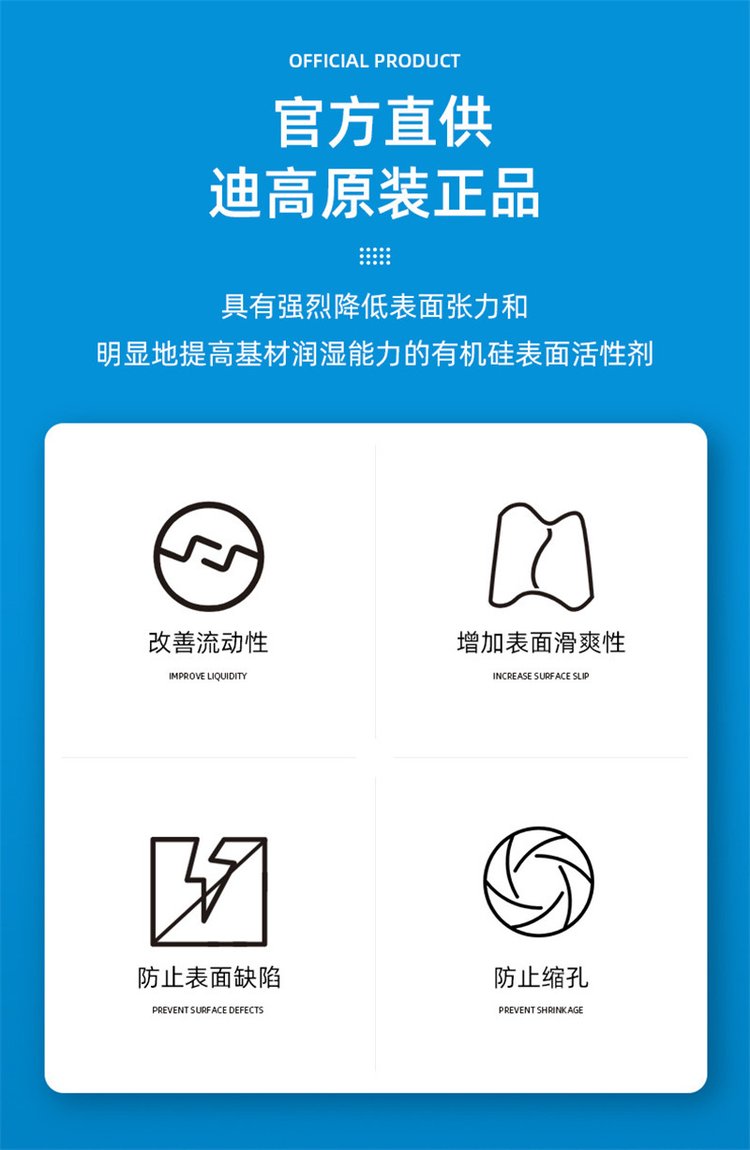 迪高tego450流平劑是一種性能優異的涂料助劑,可以改善流動性、清漆中的透明性、提高滑爽性、同時具有防縮孔效果、抗粘連/剝離效果等效果,重涂性好,對層間附著力影響極低。