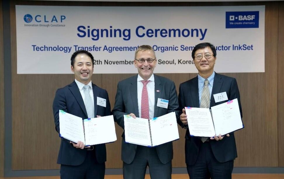 早前,韓國顯示配件及傳感器行業的領先企業 CLAP與全球化工公司巴斯夫 (BASF) 在韓國首爾簽訂 Organic Semiconductor InkSet 技術轉讓合同。
